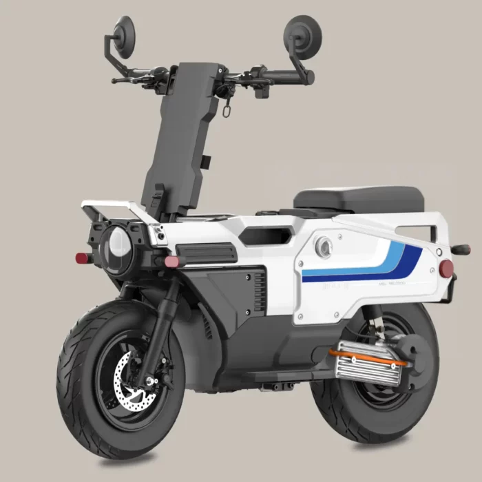 L’un des points forts majeurs du Felo M1 réside dans son format. Grâce à son système de pliage, il peut être stocké et transporté plus facilement qu’un scooter électrique conventionnel. Cette compacité répond à des problématiques bien réelles : manque de place dans les logements urbains, stationnement contraint, transport dans un véhicule utilitaire ou un van, ou encore besoin de combiner plusieurs modes de déplacement. Ce format réduit ne transforme pas le Felo M1 en simple objet de mobilité alternative. Il reste un véritable cyclomoteur électrique, stable et homologué, avec une position de conduite naturelle et rassurante. L’équilibre général du véhicule permet une prise en main rapide, y compris pour des conducteurs déjà habitués à des scooters électriques plus traditionnels.